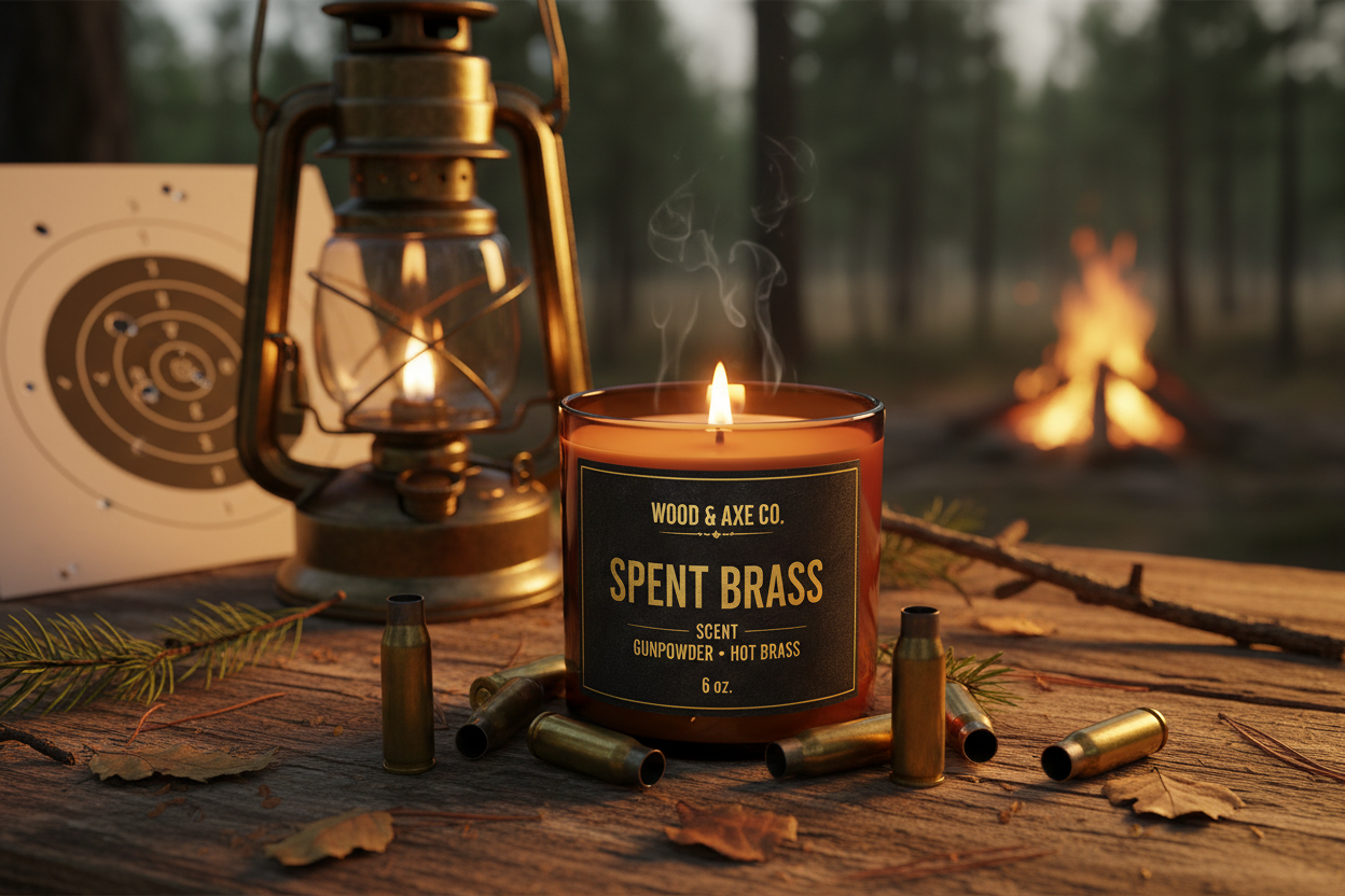 BESTSELLER — SPENT BRASS Wood. Smoke. Leather. Not sugar. Not trends. The candle that smells like a hot rifle range. Warm brass. Burnt powder. Smoke after the shot.